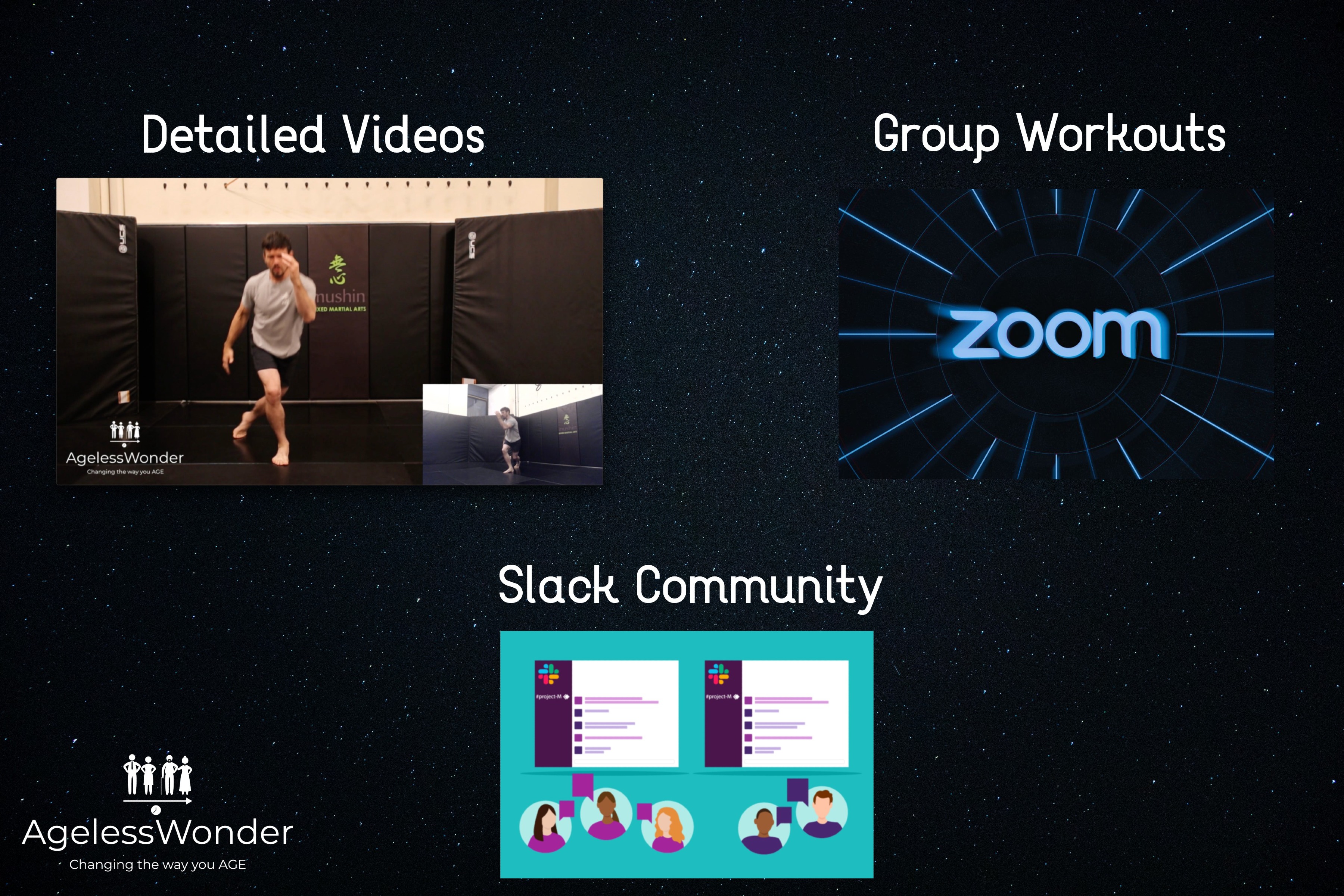 Our philosophy is that being ageless is a group effort with shared knowledge. We will be hosting webinars and have monthly experts in the fields of nutrition, pain management, and martial arts.